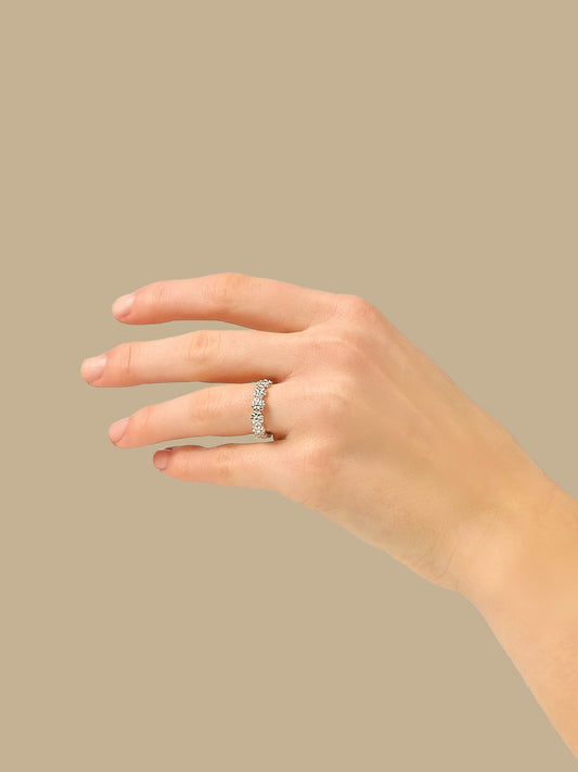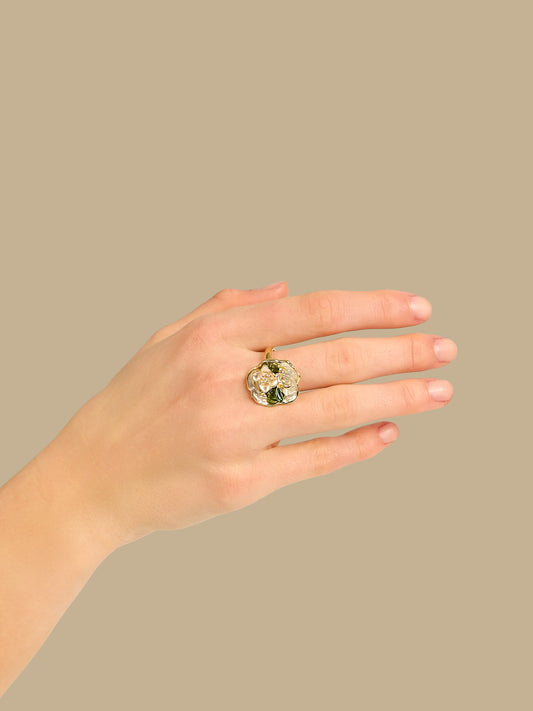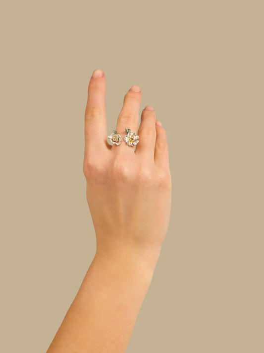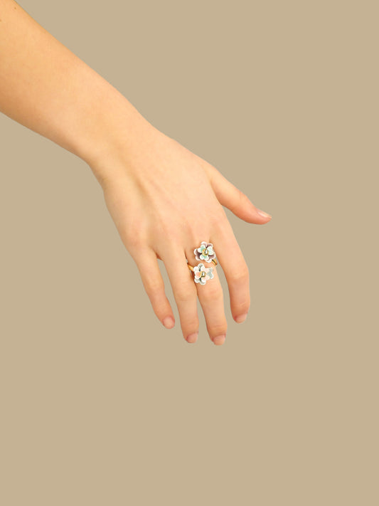 Bague ajustable deux fleurs rose pâle avec pierre en verre rose foncé