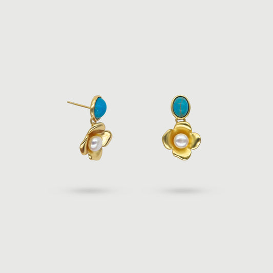 Boucles d'oreilles pierre de Chrysocolle et fleur dorée avec perle nacrée