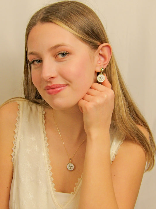 Boucles d'oreilles petites fleurs blanches avec feuilles et fruits