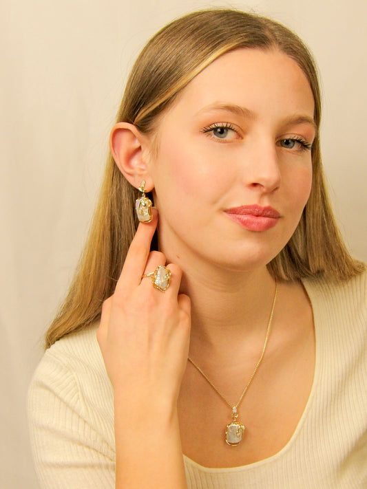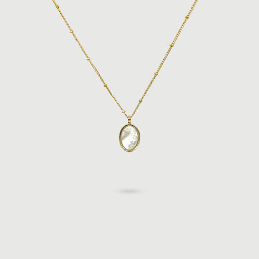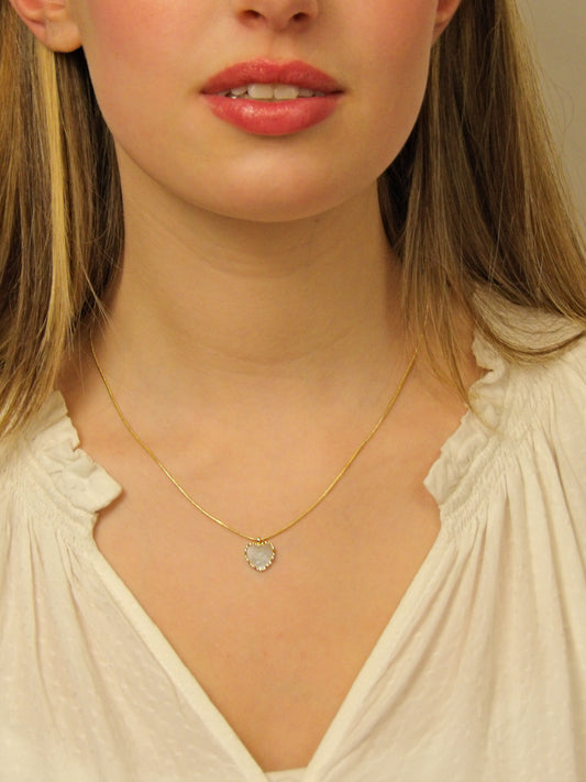 Collier coquille de perle en forme de cœur entourée de tissages dorés