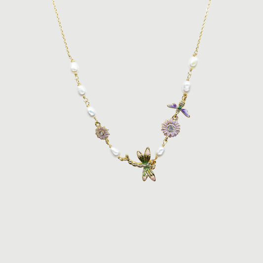 Collier détachable libellules colorées parmi des fleurs violettes et des perles
