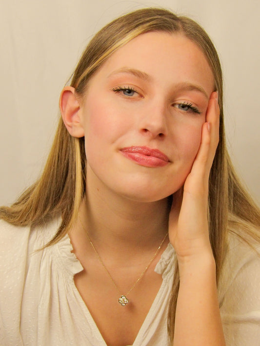 Collier fleurs blanches avec coquille de perle en forme de trèfle